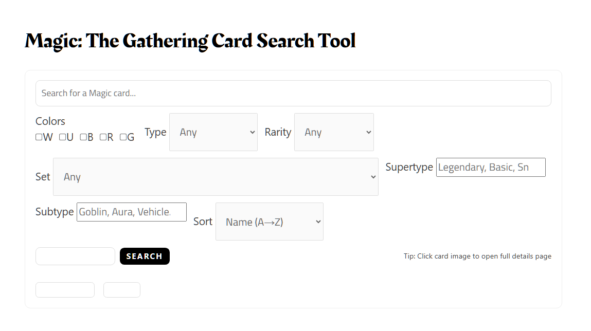 Search any Magic: The Gathering card instantly using our tool. Filter by color, type, rarity, set, and more. View full card images, rulings, oracle text, and prices—all in one place.