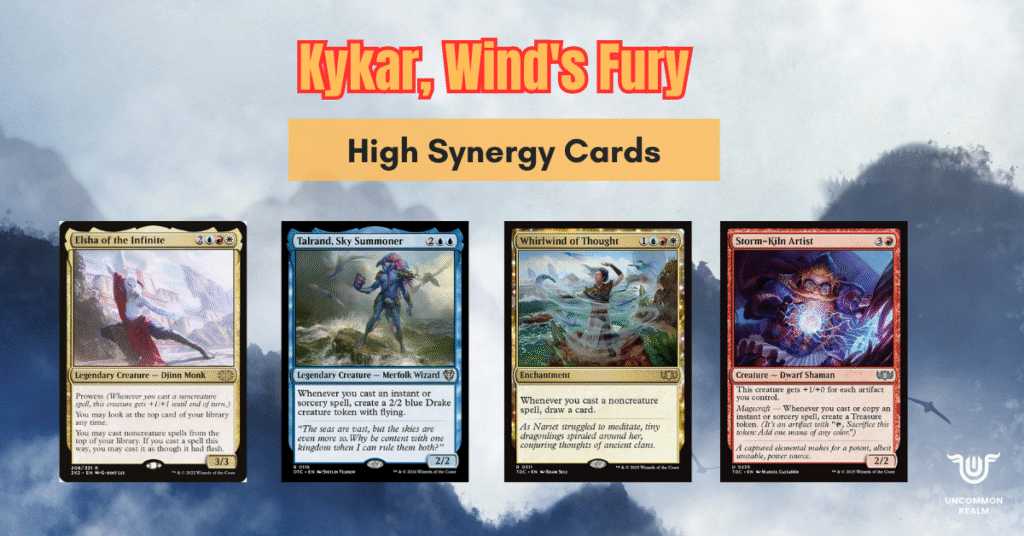 The upgraded budget list strikes a strong balance between affordability and explosiveness. It keeps Kykar’s core spell-slinging identity intact while improving consistency with card draw, mana fixing, and token synergy. Cards like Young Pyromancer, Talrand, Sky Summoner, and Monastery Mentor amplify Kykar’s ability to swarm the skies. The upgrades also include smoother mana rocks and draw engines like Archivist of Oghma and Faithless Looting to keep the deck churning efficiently — without breaking the bank.