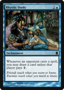Rhystic Study induces salt through social friction rather than hard restriction. It repeatedly forces opponents to choose between suboptimal sequencing (paying the tax) and conceding incremental advantage (allowing draws), while also imposing a conversational burden on the table. The sense of irritation often stems from the card’s persistent demand for attention and the cumulative snowballing it enables.