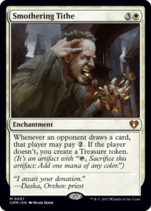 Smothering Tithe functions as a scaling resource engine that punishes the normal act of drawing cards. In practice, it frequently produces a sudden, explosive mana advantage that compresses the game into a single player’s turn cycle. Salt arises when opponents feel compelled to spend early turns paying taxes, only to fall behind anyway, or when the controller converts the treasure differential into immediate dominance.