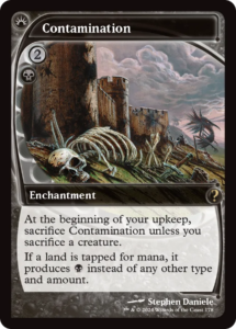 Contamination is a severe color-based lock that restricts mana production while leveraging sacrifice synergies to maintain itself. In many pods, it effectively removes multicolor decks from meaningful participation until it is answered, which may not be feasible under the lock itself. The card’s salt profile comes from how directly it translates a single resolved enchantment into widespread functional inaction.